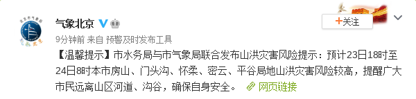 北京市水务局与市气象局联合发布山洪灾害黄色预警