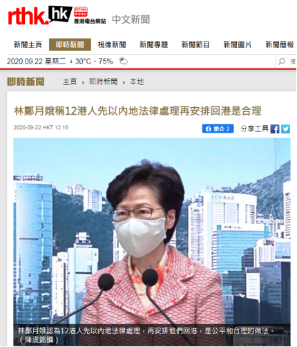 12名偷渡的乱港分子被刑拘 林郑月娥:先以內地法律处理再安排回港较公平合理