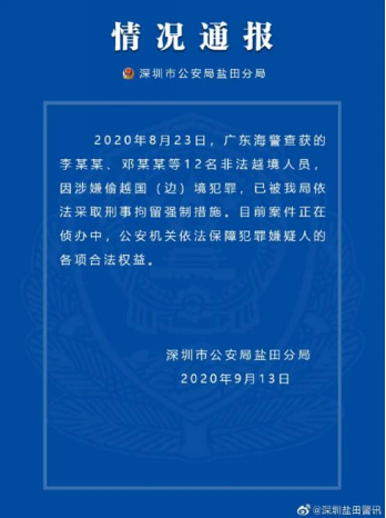 9月13日,据@深圳盐田警训 消息,8月23日广东海警查获的12名非法越境人员,因涉嫌偷越国(边)境犯罪,已被依法采取刑事拘留强制措施。