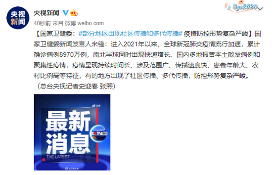 国家卫健委:部分地区出现社区传播和多代传播 疫情防控形势复杂严峻