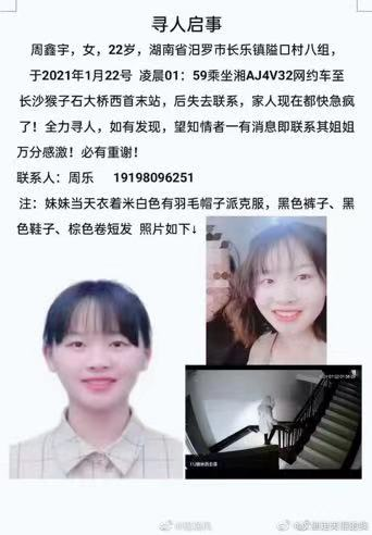据家属发布的寻人启事显示,女孩名叫周鑫宇,今年22岁,是湖南省汨罗市长乐镇隘口村八组人。1月22日凌晨1点59乘坐网约车至长沙猴子石大桥西首末站,后失去联系。据寻人启事显示,女孩为棕色卷短发,失联当天身穿有羽毛帽的米白色派克服、黑色裤子及黑色鞋子。“家人现在都快急疯了!全力寻人。如有发现,望知情者一有消息即联系其姐姐。万分感谢!必有重谢!”寻人启事称。