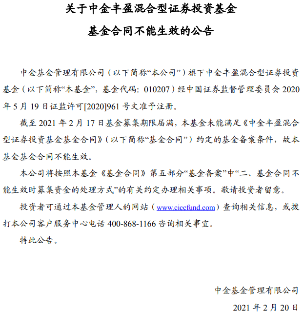 2月20日,中金基金发布关于中金丰盈混合型证券投资基金基金合同不能生效的公告。公告显示,截至2021年2月17日基金募集期限届满,未能满足《中金丰盈混合型证券投资基金基金合同》约定的基金备案条件,故基金合同不能生效。