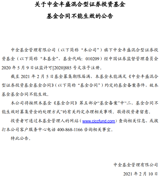 而在2月10日,中金基金还于发布了关于中金丰盛混合型证券投资基金基金合同不能生效的公告。同样是因为募集期限届满,未能满足约定的基金备案条件,故基金合同不能生效。