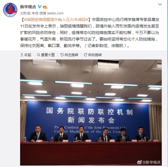 中国疾控中心流行病学首席专家吴尊友11日在发布会上表示,瑞丽疫情提醒我们,因境外输入而引发国内疫情发生甚至扩散的风险依然存在,同时,疫情常态化防控措施落实不能松懈,千万不要以为春暖花开,气温升高,新冠流行季节过去了。要始终坚持常态化个人防控措施,保持社交距离、戴口罩、勤洗手等。