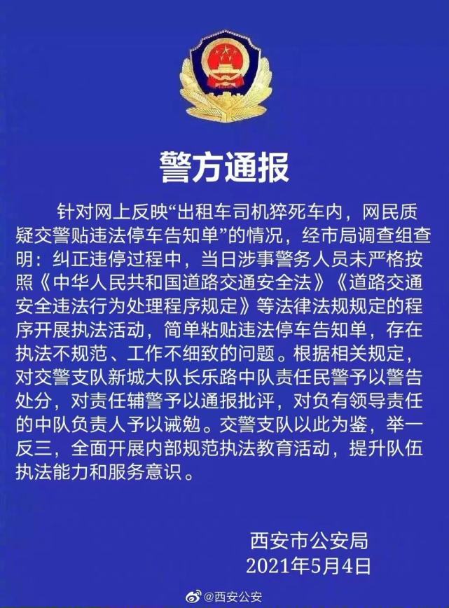 西安市公安局5月4日晚通报,针对网上反映“出租车司机猝死车内,网民质疑交警贴违法停车告知单”的情况,经市局调查组查明:纠正违停过程中,当日涉事警务人员未严格按照《中华人民共和国道路交通安全法》《道路交通安全违法行为处理程序规定》等法律法规规定的程序开展执法活动,简单粘贴违法停车告知单,存在执法不规范、工作不细致的问题。根据相关规定,对交警支队新城大队长乐路中队责任民警予以警告处分,对责任辅警予以通报批评,对负有领导责任的中队负责人予以诫勉。交警支队以此为鉴,举一反三,全面开展内部规范执法教育活动,提升队伍执法能力和服务意识。