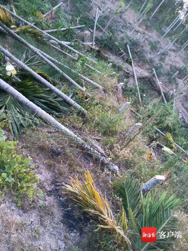 记者在会山镇东太农场下高速1公里左右的一片槟榔地里看到,几十株大大小小的槟榔树、椰子树被腰斩,倒成一排排。倒下的槟榔树基本上是一刀砍下,刀口处还是崭新的。