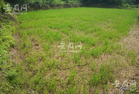 在另一户村民家的秧田边,记者看到秧苗已经长到了五六厘米高,但眼前是一片枯黄色,有成片的枯死现象,秧田已经十分干涸,出现了裂缝,“不是不想抽水浇灌,是因为下游水塘里的水有毒,根本不敢抽用。”