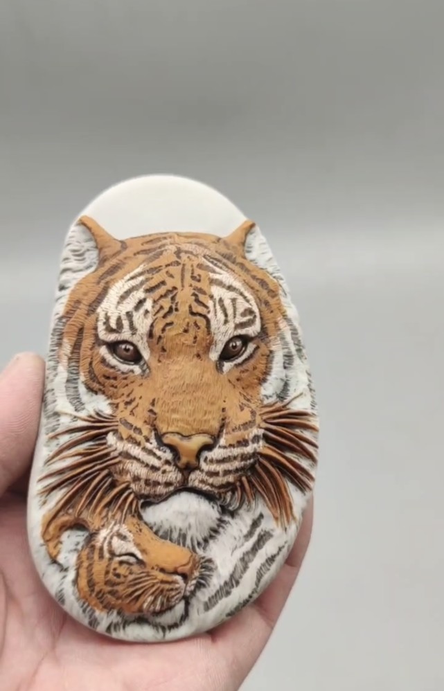 李明凯对北青-北京头条记者说,他在挑选石头的时候也要有些注意的地方。“首先就是要看颜色,颜色要和题材能够搭配上,比如刻老虎的话,因为老虎是黄色的,石头的颜色需要符合。然后就是要看石头的纹理,也要符合动物的特征。”李明凯说,有些石头是他在河水中捡到的,还有很多石头都是他自己买的,尤其是一些对颜色要求高的石头。在雕刻完成之后,李明凯也会根据效果再稍微进行些加工,例如对老虎的雕刻,除了黄色和白色是石头本身颜色外,刻完后也会加些黑色色彩,让效果更加逼真。