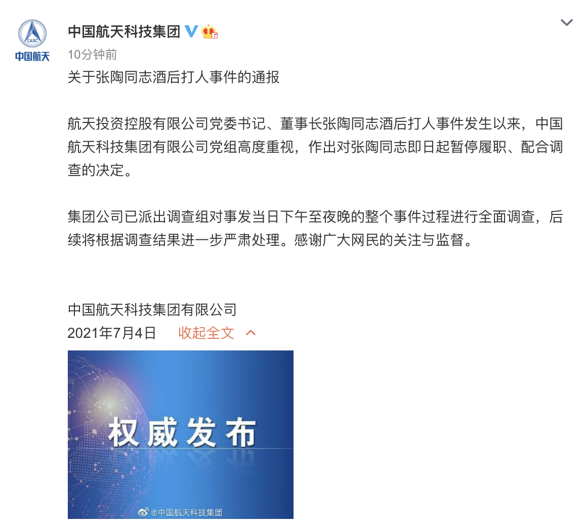 航天投资控股有限公司党委书记、董事长张陶同志酒后打人事件发生以来,中国航天科技集团有限公司党组高度重视,作出对张陶同志即日起暂停履职、配合调查的决定。