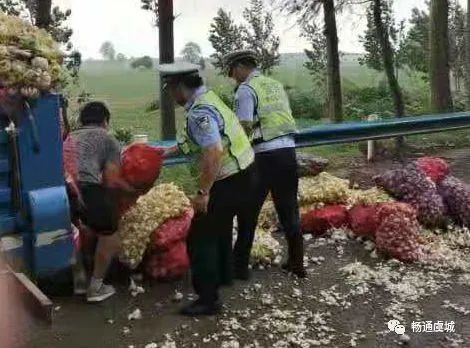 为避免发生意外,民警一方面拉响警笛,示意来往车辆减速慢行,并在来车方向摆放警示标牌和安全反光锥筒,引导车辆安全行驶;另一方面要求刘师傅将车辆停到路边安全地带,大家一起动手,帮助刘师傅将散落的大蒜捡拾装袋,移至路边重新装车。