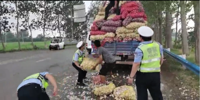 货车拉大蒜撒一地 商丘交警变身装卸工