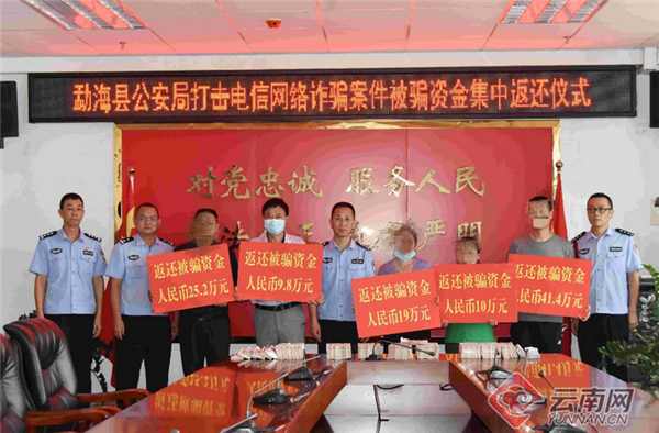 近日,云南省西双版纳勐海警方举行电信网络诈骗案件被骗资金集中返还仪式,将近期侦破5起“冒充领导干部”电信网络诈骗案件追回的105万元被骗资金集中返还受害人,并向群众宣传防诈知识,指导大家安装“国家反诈中心APP”。