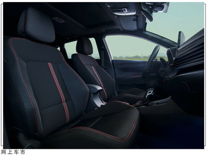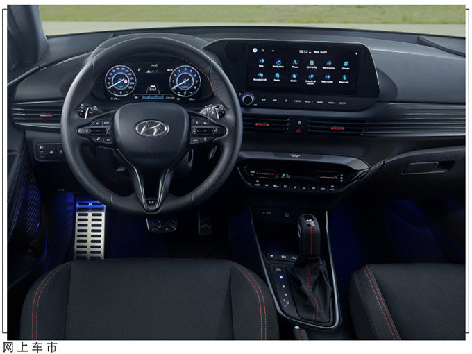 内饰上,全新i20 N Line采用了现代全新家族式造型,新车标配有翻毛皮材质的桶形运动座椅,上有红色缝线进行装饰。配备有液晶数字仪表+悬浮式液晶屏,并且在细节处还采用了红色饰条进行点缀,运动属性得到彰显。