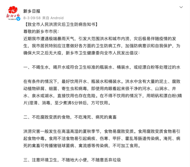 政知君注意到,就在8月3日,新乡市卫健委、新乡市健康教育所曾发布《致全市人民洪涝灾后卫生防病告知书》。