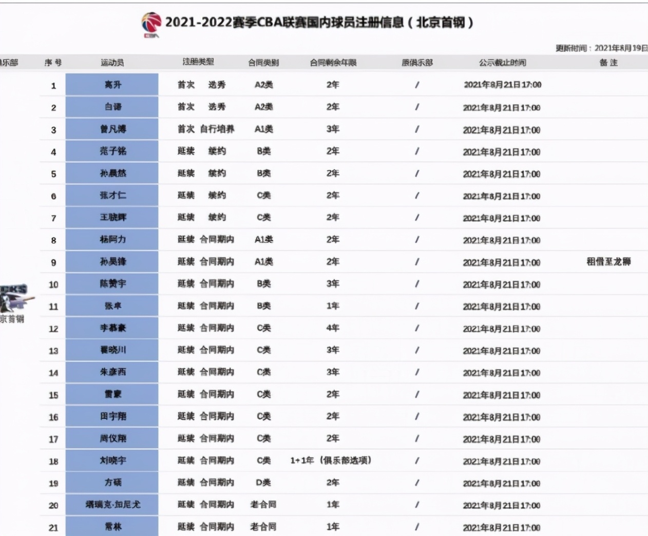 在19日CBA联盟官方公布的北京首钢2021-2022赛季国内球员注册信息中,包含翟晓川、朱彦西、方硕、常林、刘晓宇、王骁辉、周仪翔、范子铭、李慕豪等球员的合同,均是延续状态。方硕与北京首钢还剩下为期2年的D类(顶薪)合同,刘晓宇与北京首钢的合同为1+1(最后一年为球队选项)。范子铭与北京首钢延续了为期2年的B类合同。