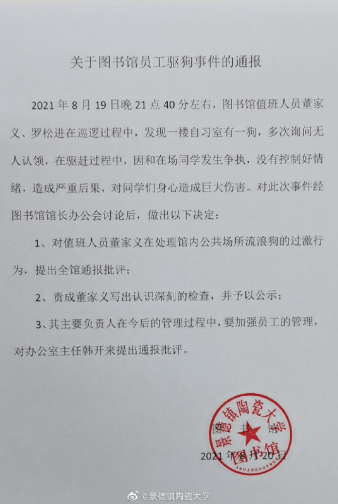 近日,有网友发文称,景德镇陶瓷大学一图书馆保安当众用铁棒打死流浪狗。8月20日,@景德镇陶瓷大学 发布关于图书馆员工驱狗事件的通报,对值班人员在处理馆内公共场所流浪狗的过激行为,提出全馆通报批评。其主要负责人在今后的管理过程中,要加强员工的管理,对办公室主任提出通报批评。