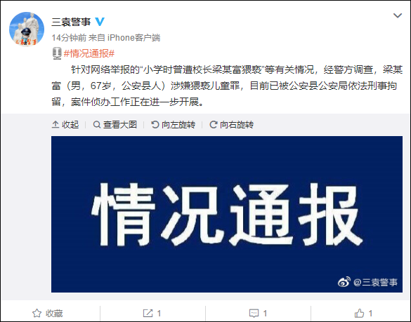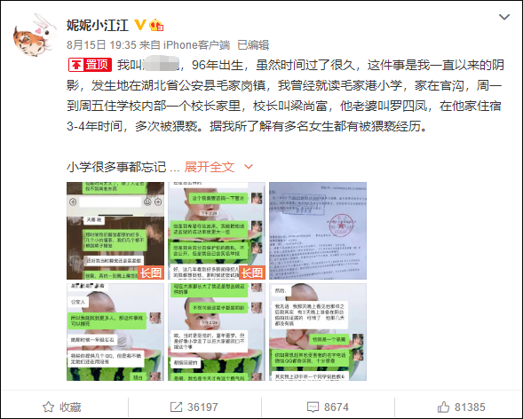 此前,微博备注为“女子实名举报小学时遭校长猥亵事件当事人”的@妮妮小江江 发布多条微博,实名举报曾遭所就读的毛家港小学的校长猥亵,还称多名女生都有被猥亵经历,目前,她已向公安机关报警。