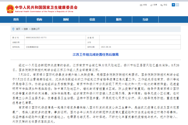 国家卫健委:南京市全域已降为低风险地区 江苏工作组完成处置任务后撤离