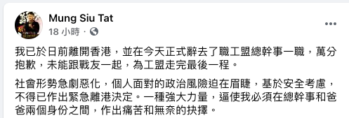 此外,“职工盟”总干事蒙兆达已于9月18日在社交媒体发文宣布辞职,并称“基于安全考虑”,“不得已”离开香港。有港媒报道,他目前身处英国。