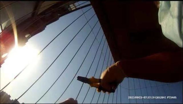 几分钟后,救援警力已将防护网破出了一个洞口。辅警汤文杰是在场警力当中相对瘦小灵活的,又是部队特战旅的侦察兵出身,他当机立断将救援腰带和静力绳绑在了自己的腰部,其余警力在室内紧紧拉住了静力绳。