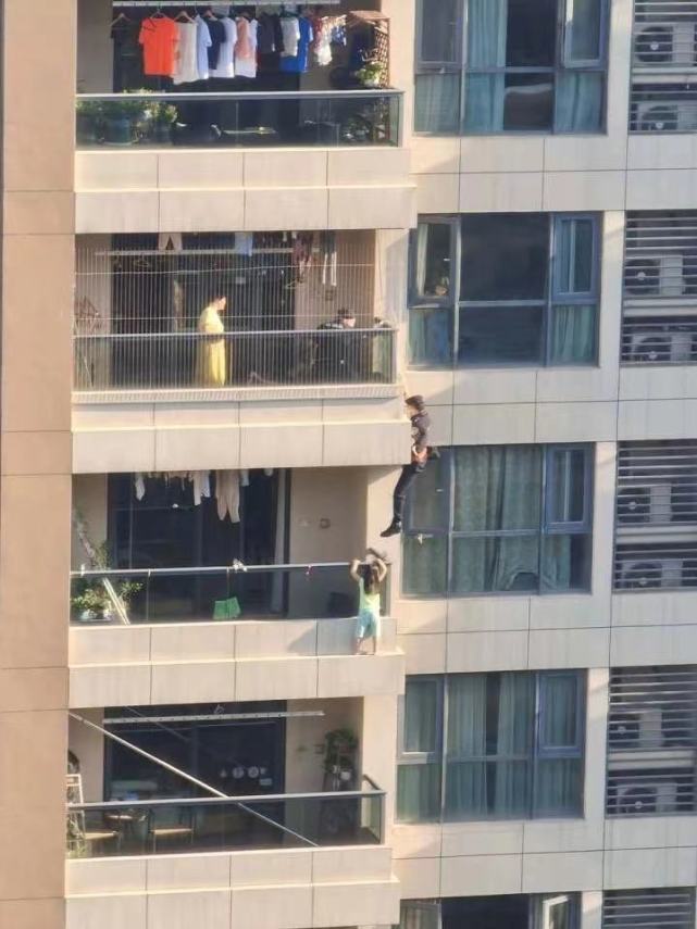 “我下去了。”汤文杰小心翼翼地从12楼阳台翻出,双手紧紧扒住12楼阳台边,一只脚慢慢踩在了11楼的一扇窗户上,另一只脚则往小女孩所在的阳台外探去……