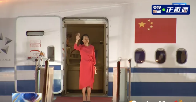舱门打开,孟晚舟一袭红衣走出机舱,向大家挥手致意。她的胸前还别着一枚五星红旗的胸针。
