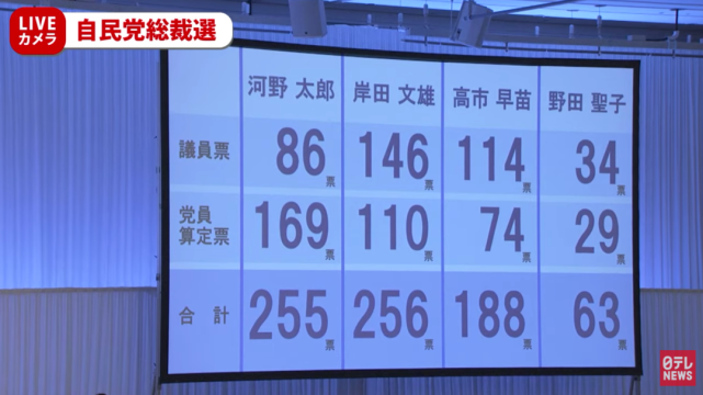 在第一轮投票中,岸田文雄共获得256票,名列第一。但由于票数未能过半,两人进入第二轮投票。