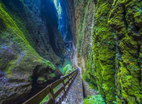 龙水峡地缝同样属于中国南方喀斯特世界自然遗产核心景区,是国家级地质科学研究基地、国家岩溶地质公园。此处经几千万年前造山运动而形成,属典型喀斯特地貌景观。地缝形如其名,就像地球裂开一道深邃的缝隙,谷底最窄处只一米之遥,最宽处也不足十米,缝口与谷底之间高达350余米,谷底溪水孱孱,清澈见底。在这里,游客可以感受峡谷岩壁80米的奇妙穿越之旅直达地心,还可以观高山峡谷飞瀑,体验峡谷栈道凌空漫步。