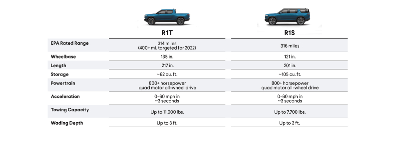 Rivian两款车的主要参数