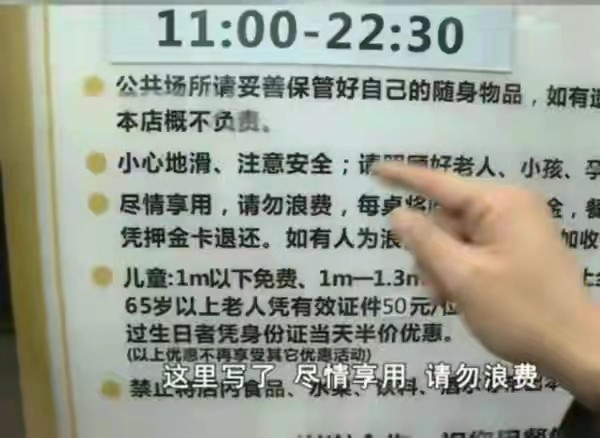 北青-北京头条记者在网络上搜索该门店发现,该店原价为65元的单人自助餐,团购优惠价为58.8元。当地媒体发布的视频显示,该门店的牌子上标有“尽情享用,请勿浪费”的提示,且每桌收有50元钱的押金。康先生认为,自己并没有浪费,商家这样是玩不起的表现。