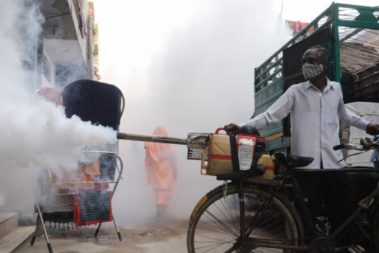印度工作人员在街头进行熏蒸消毒