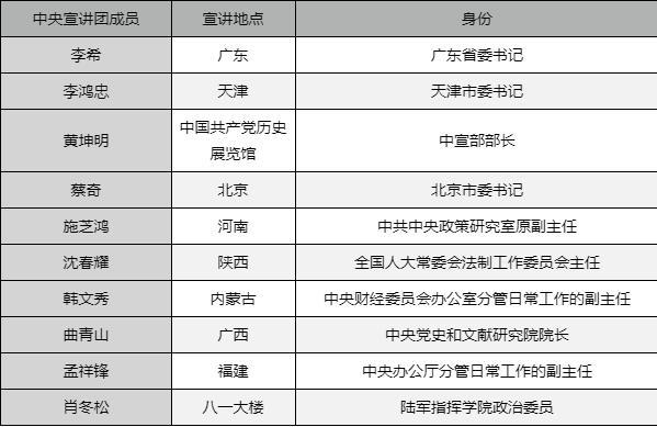 政知圈(微信ID:wepolitics)根据公开报道不完全统计,目前已披露的中央宣讲团成员有: