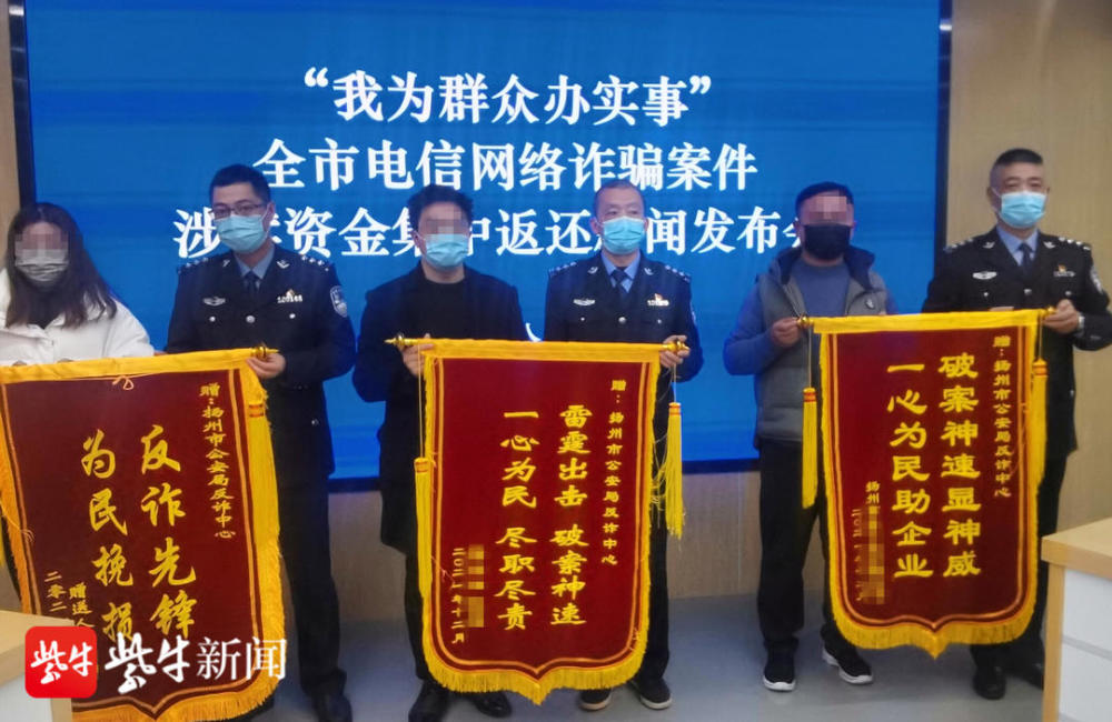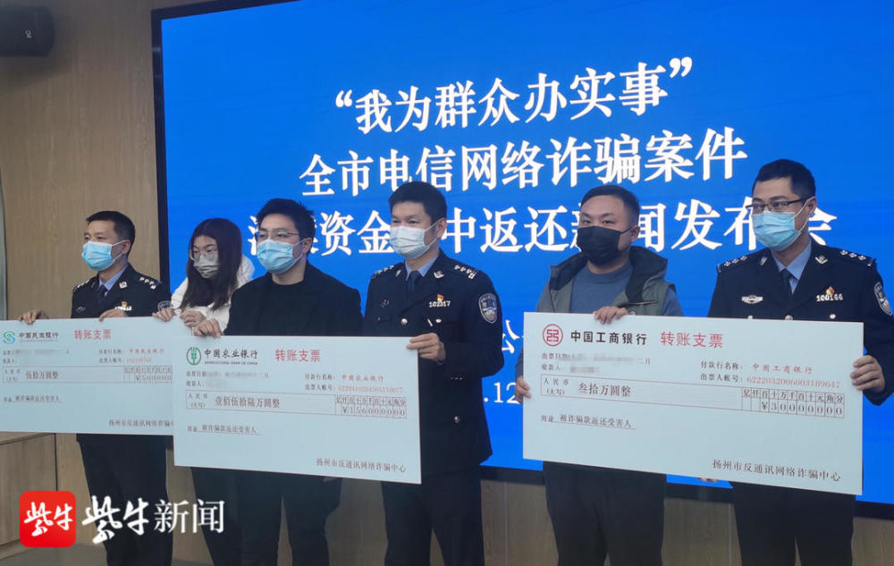 10日,扬州市公安局召开新闻发布会,通报2021年扬州警方打击治理电信网络诈骗犯罪工作的重要举措和突出成效,同时举行今年第三场涉案资金集中返还活动,现场对295笔、2384万余元涉案资金进行集中返还。据悉,2021年1-11月,全市电信网络诈骗案发案同比下降23.2%,经济损失同比下降27.3%,破获电诈案件1142起,近年来持续高发的电信网络诈骗犯罪初步得到有效遏制。