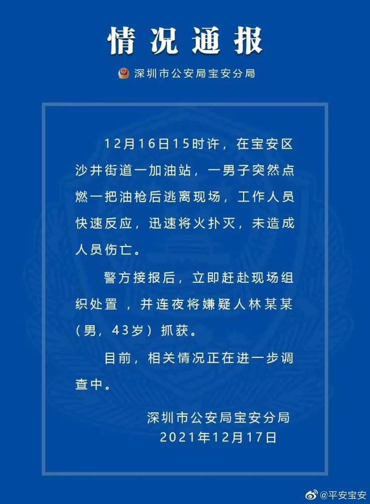 16日15时许,广东深圳,一男子在加油站拔油枪点燃汽车后逃逸。17日18点07,@平安宝安 通报,嫌疑人林某某(男,43岁)已被抓获,相关情况正在进一步调查中。
