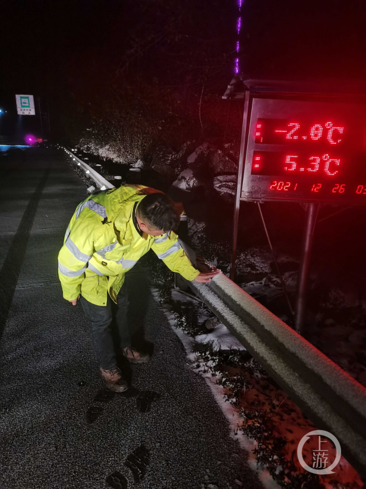 12月26日,上游新闻记者从重庆高速集团东南营运分公司获悉,受冷空气影响,渝湘高速黔江、酉阳、秀山段迎来今冬首场降雪,最低温度-2.5℃。受降雪天气影响,黔江西、酉阳、秀山等多个收费站入口实行交通管制。