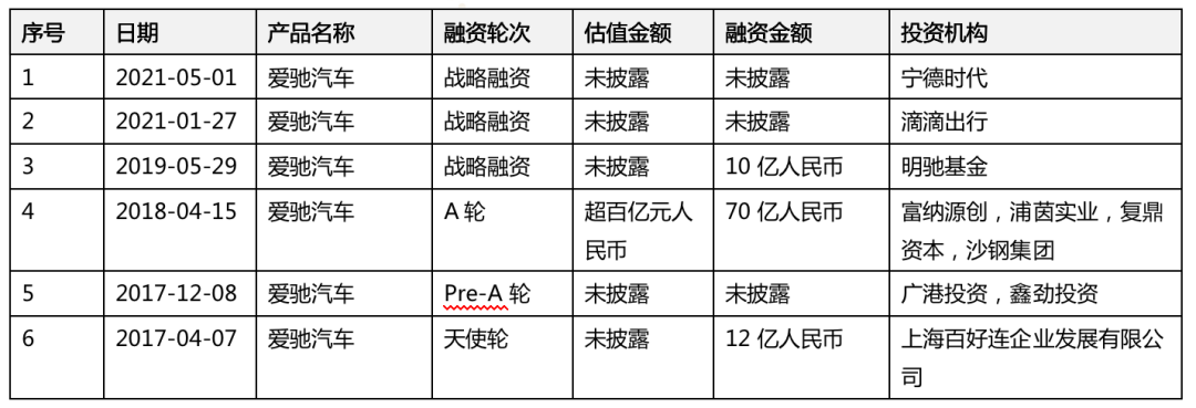 公开信息显示,在这一轮融资之前,爱驰汽车已累计完成6轮融资。资方阵容包括上海百好连、广港投资、鑫劲投资、沙钢集团、明驰基金、宁德时代等,已公布的融资总额超90亿元人民币。