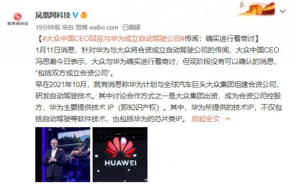 大众回应与华为成立自动驾驶公司传闻:确实在商讨中
