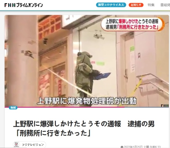 日本富士新闻网(FNN)FNN25日报道,警方24日发布消息,日本一男子23日下午用公共电话告诉警方“在(东京)上野站设置了炸弹”。不过,该男子的话为谎言,警方将其逮捕,指控其涉嫌妨碍公务。