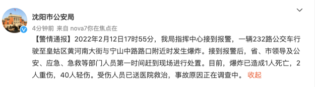 2022年2月12日17时55分,我局指挥中心接到报警,一辆232路公交车行驶至皇姑区黄河南大街与宁山中路路口附近时发生爆炸。接到报警后,省、市领导及公安、应急、急救等部门人员第一时间赶到现场进行处置。目前,爆炸已造成1人死亡,2人重伤,40人轻伤。受伤人员已送医院救治,事故原因正在调查中。