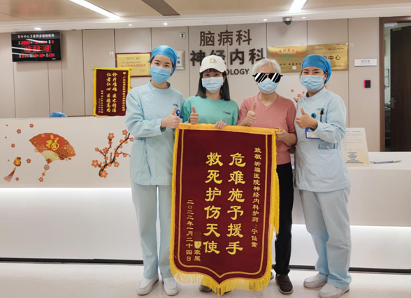 据患者家属反映,老爷爷有心脏病、慢阻肺病史,当天外出回家到楼下时突然倒地,家里人都不知所措,孙女想做心肺复苏但又怕自己不专业,现场一片混乱,幸好宁仙童及时出手相助,她反应敏锐,功底扎实,指挥有序。时隔近2个月,老爷爷的老伴得知宁仙童是广东祈福医院神经内科的护士,为表达感激之情,特意定制了一面锦旗送到医院。