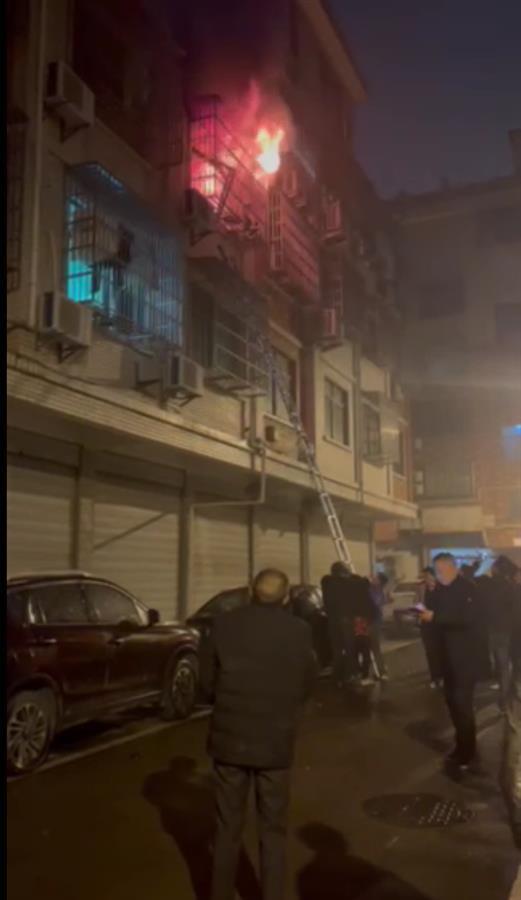 网传视频显示,一居民楼三楼的房间中,有火苗不断蹿出窗外,楼下有居民架起长梯营救被困人员。另一则视频显示,消防人员已经到场,正在扑灭房内大火。