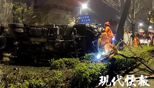 据介绍,事发当日,接警后,南通消防立即调派长江路特勤站3车18人赶赴现场处置。消防救援人员到场后发现,货车侧翻在地,车头损伤严重,撞到了周边的绿化和路灯。此时,司机被困驾驶室内,自行解开了安全带,没有受伤,但因受到惊吓情绪不稳。
