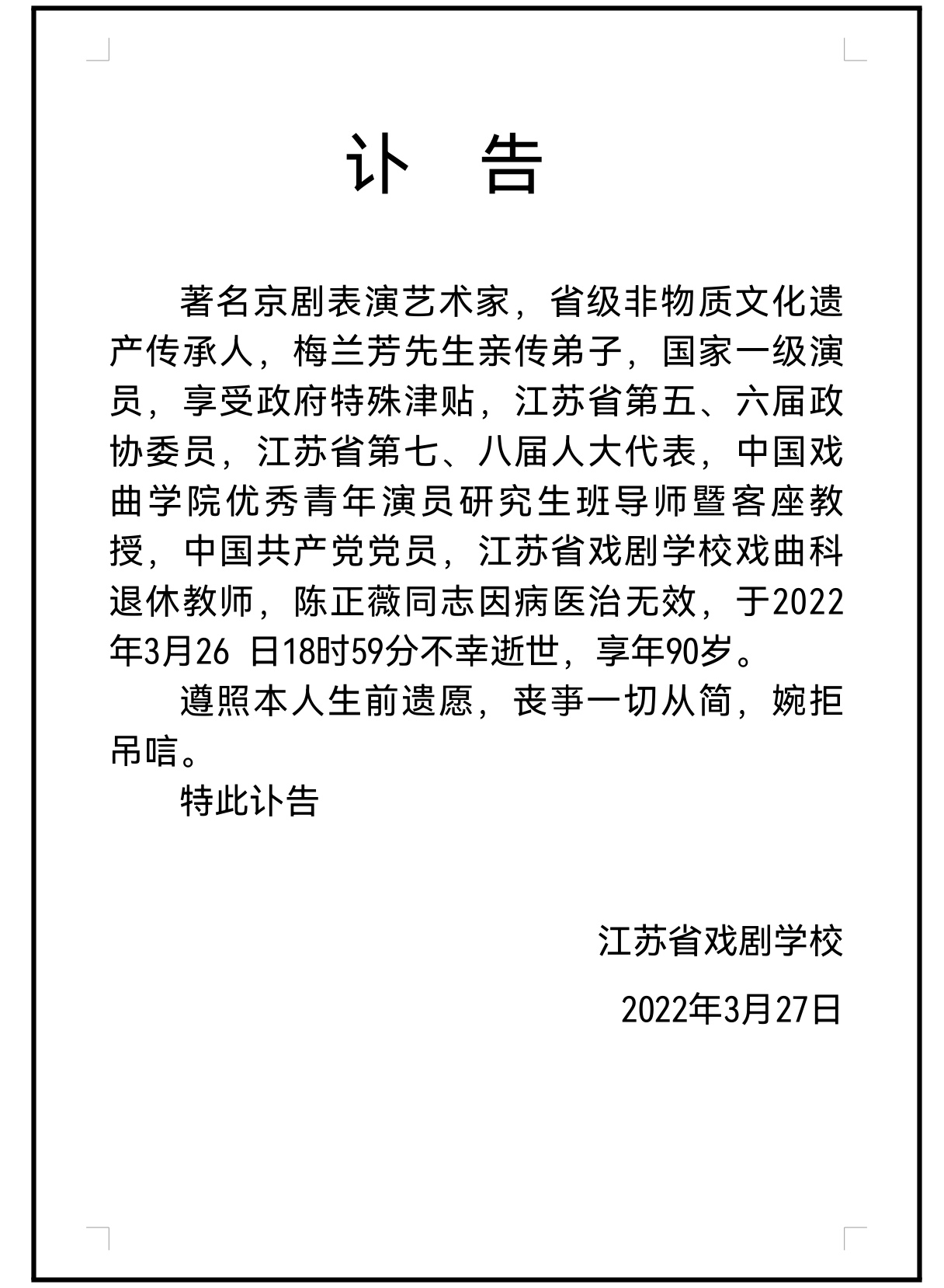 著名京剧表演艺术家、省级非遗传承人,梅兰芳先生亲传弟子陈正薇,于2022年3月26日在南京逝世,享年90岁。记者从她生前执教的江苏省戏校获悉,遵照本人生前遗愿,丧事一切从简,婉拒吊唁。