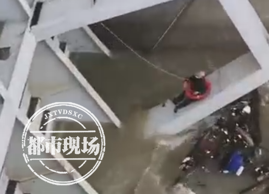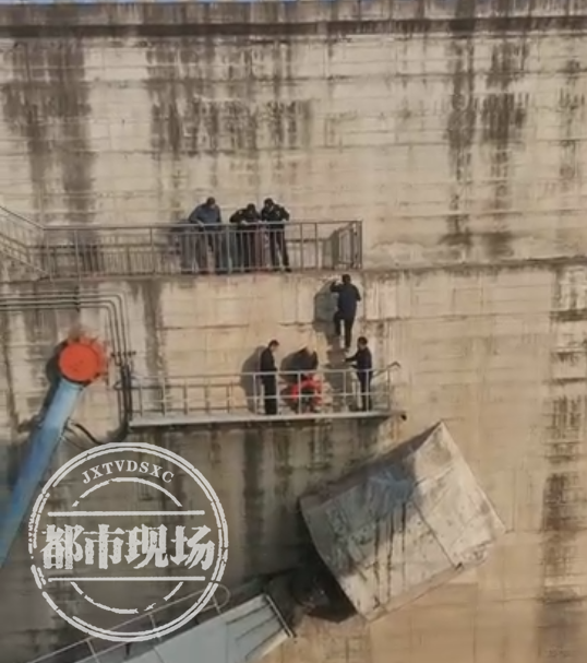 江西龙头山航电枢纽投资开发有限公司安全部负责人 陈振华:施救过程中,我们放了一根绳子下去,让他把救生圈和绳子同时绑在身上,然后我们一点一点的从弧型闸的支架上叫他慢慢地往上爬,最后我们把绳子慢慢收紧,爬到最后6米左右,我们站在柱子上把他带起来。