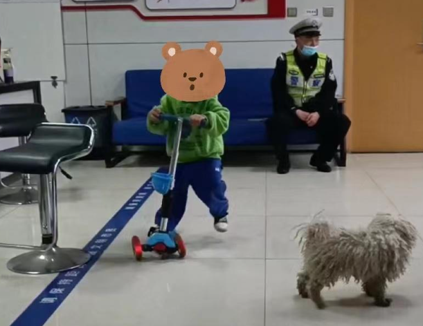 民警发现后,赶紧拦下孩子,将其带到安全地带。面对警察叔叔,男孩不哭也不闹,但是说不出自己和父母的姓名,以及父母的联系方式,只知道自己今年三岁,小狗是自己家的。