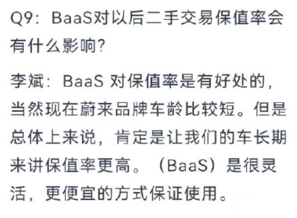 最后就是保值率的问题,影响电动汽车保值率的很大一个因素就是电池,理论上使用时间越长,电池的衰减就越明显。按照蔚来原先的设想,如果选择BaaS,那么用户等于避开了电池折旧、衰减等等问题,对于车辆的保值是有积极作用的。蔚来汽车的CEO李斌就曾经明确表示,BaaS对保值率是有好处的。