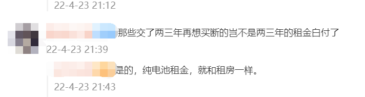 但也有网友表达了不同的看法,他们认为既然之前的是租电池,那么支付租金是理所应当的,现在想买那就另外付买电池的钱。就像租房子和买房子一样,一套房子租了两三年,肯定是要付租金的,现在房东想卖房而你又恰好想买房,难道前几年的租金还要退给你不成?
