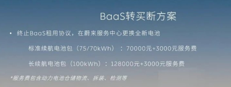 对于购车时选择了电池租赁模式的 BaaS 用户,可以重新买一块新电池转为买断,新电池价格和新车上的电池价格保持一致,标准续航电池包(75/70 kWh),价格为7万元;长续航电池包(100kWh):价格为 12.8 万。