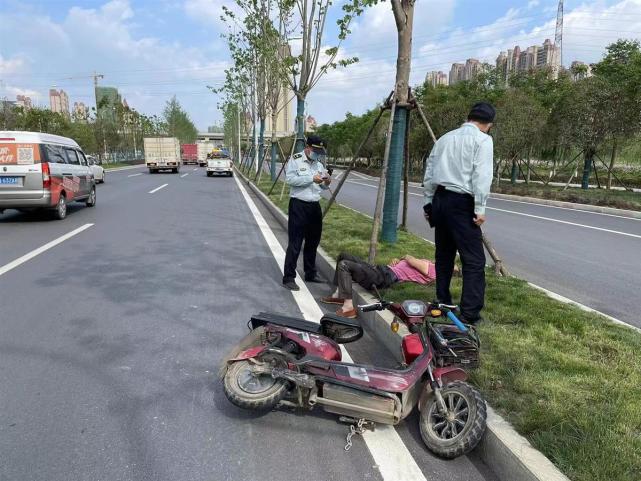 4月26日下午3时许,东西湖区径河城管队员王思泽、程志豪和李俊3人进行日常“路长制网格化”巡查时,在金山大道新城十二路至四环线桥下路段处的马路站石绿化带处发现一中年男子仰卧,脸上、身上等部位有血迹,还有一辆电动车倒在身边不远处。