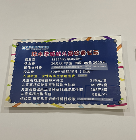 魏女士的孩子在该幼儿园上中班,今年元宵节前一天魏女士将孩子从其他幼儿园转入新未来汉水华城幼儿园。“当时就是看幼儿园的宣传,质量非常高,很多附近的父母都选择将孩子送入这个幼儿园,他的收费可不低”。从魏女士提供一张写着“汉水华城幼儿园收费公示”的蓝色牌子显示,保教费 12880元/学期/学生 ,伙食费 20元/天/学生,操作材料费 据实收取 670元/学期/学生,校车费 500元/学期/学生(自愿) ……“每年学费23000到27000,也不是很便宜。”魏女士道表示,目前有孩子已经在医院做身体检查。